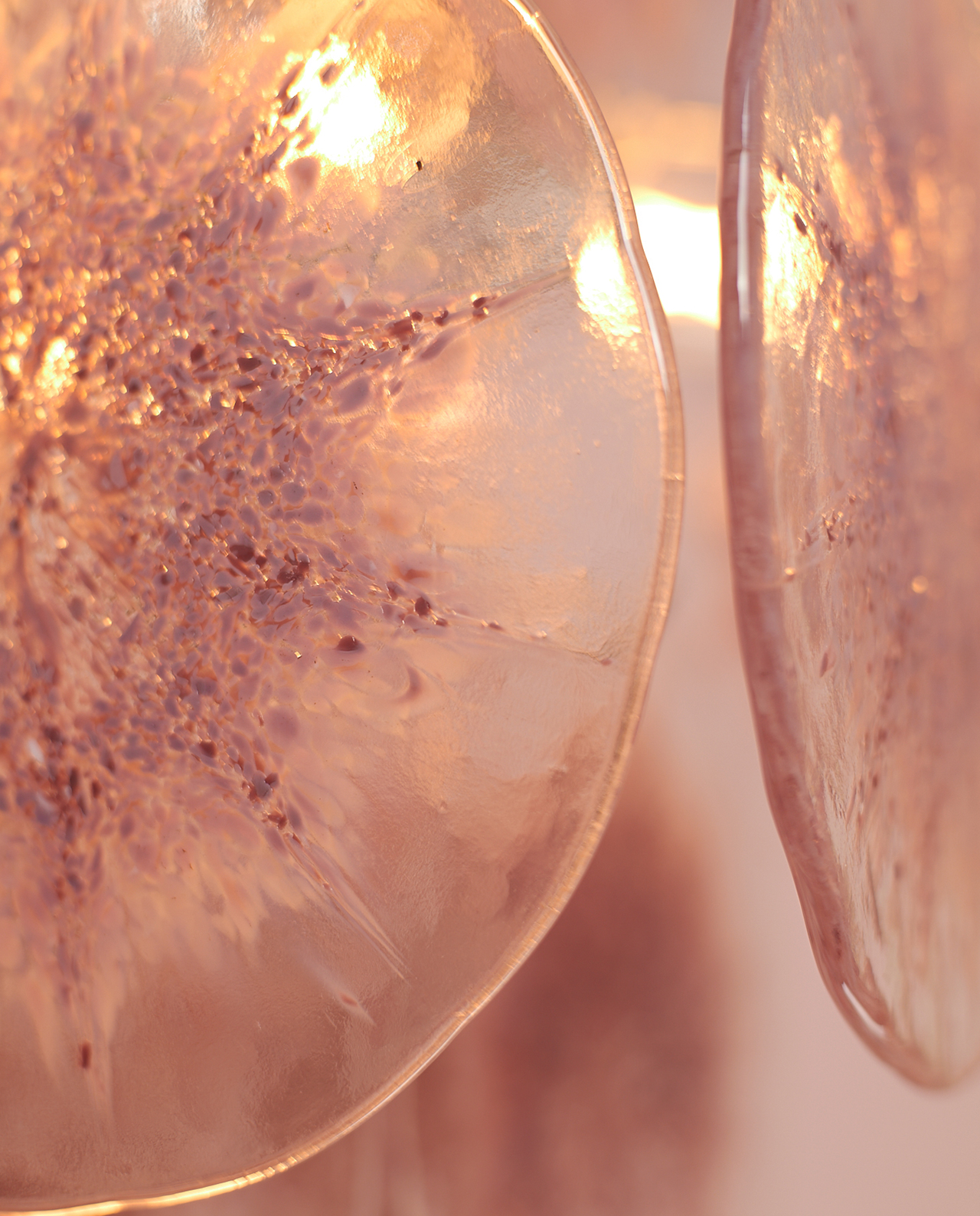 Vistosi Murano Designlamp van Gino Vistosi, vormgegeven als een schijfkroonluchter, trekt direct de aandacht met zijn mondgeblazen glaselementen.