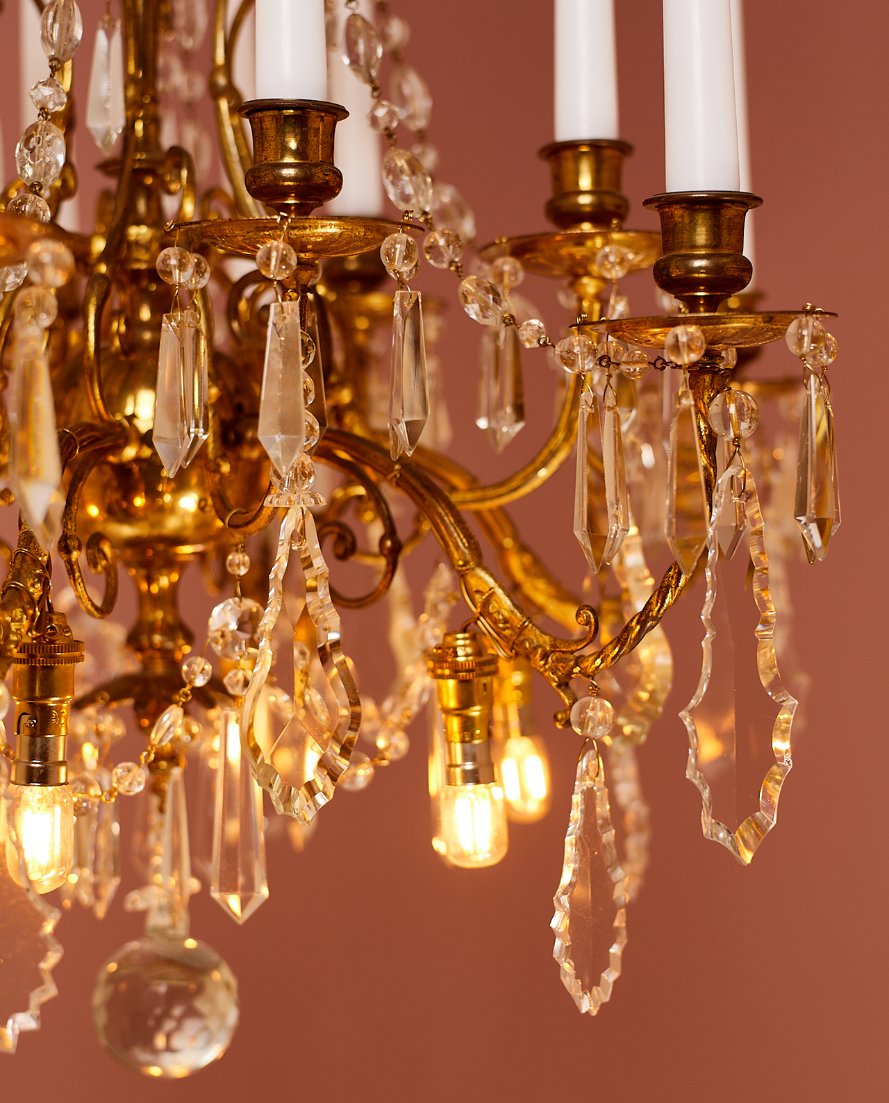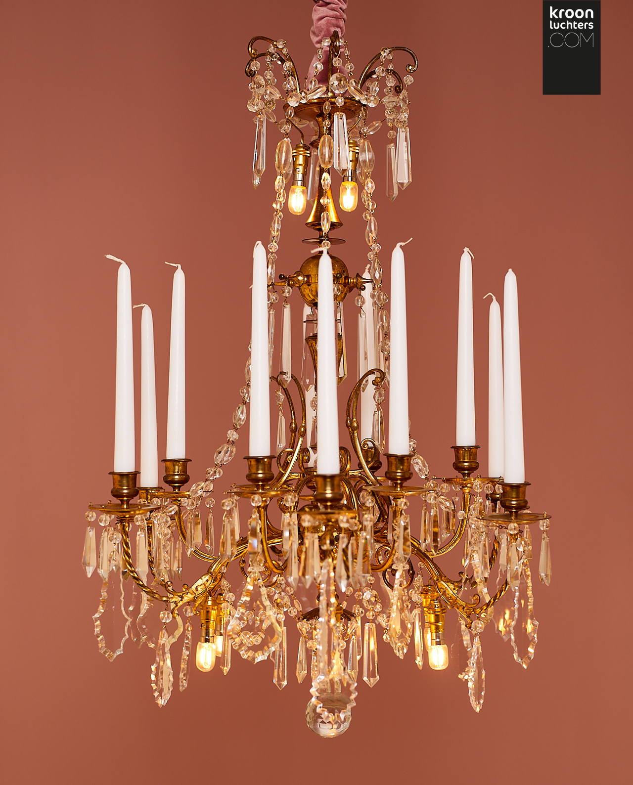 Kristallen verguld bronzen kroonluchter uit de 19e eeuw. Deze vergulde kroonluchter is rijk behangen met kettingen van handgeslepen glazen en kristallen kralen en pegels. Kleine Led lampjes zijn verspreid door de gehele kroonluchter.